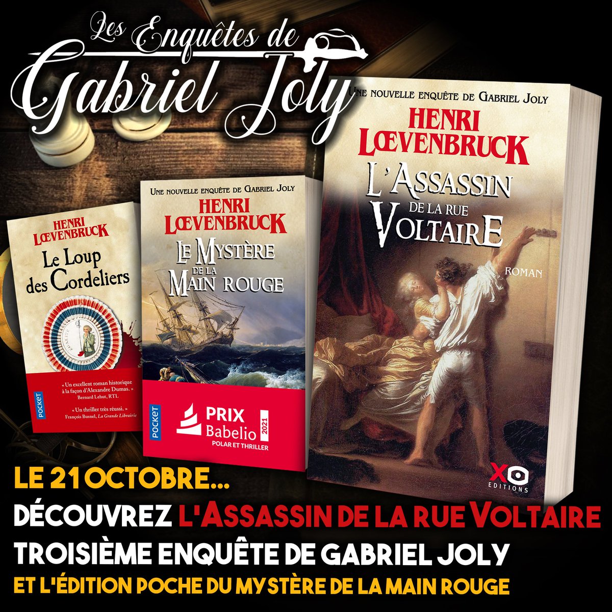 Ce 21 octobre est sorti le 3e opus tant attendu, des aventures de Gabriel Joly, dans la série « du Loup des Cordeliers » un roman policier historique dont l’intrigue se passe sous la Révolution, mais pas que…Henri Loevenbruck est un couteau suisse, tout ce qu’il touche est création ! musicien, écrivain, journaliste…un surdoué de la matière qu’il sait transformée avec habilité.